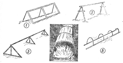 Каркасы для пленочных укрытий: 1 — двустворчая рама; 2 — козелковый каркас; 3 — каркас латвийского НИИ земледелия; 4—дуговидный каркас; 5—каркас на параллельных рейках